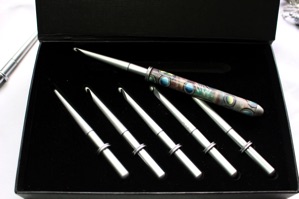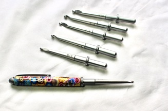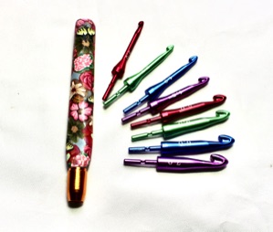 The handle of this interchangeable crochet hook set is covered with polymer clay. It is a millefiori design that has been sanded and polished until it feels smooth in the hand. The handle is large and comfortable so if you or someone you know needs a more ergonomic crochet hook, this is the answer. Its overall weight is about 1 oz, so very light in the hand.